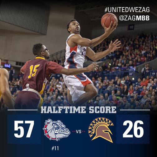 It is halftime in The Kennel @ZagMBB leads St. Thomas Aquinas 57-26! @byron_wesley has racked up 18 pts and 4 reb!pic.twitter.com/58VVbi3OwX