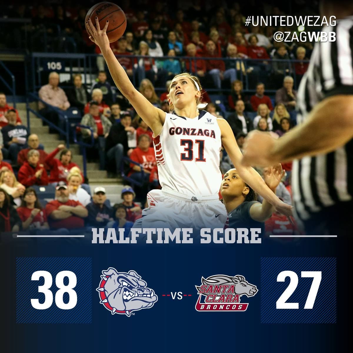 It's halftime here in The Kennel. @ZagWBB leads Santa Clara 38-27. #UnitedWeZagpic.twitter.com/chkvdOwi3I