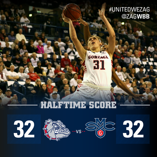 It's halftime here in The Kennel! @ZagWBB and Saint Mary's are tied up at 32. #UnitedWeZagpic.twitter.com/PT1DYww7d8