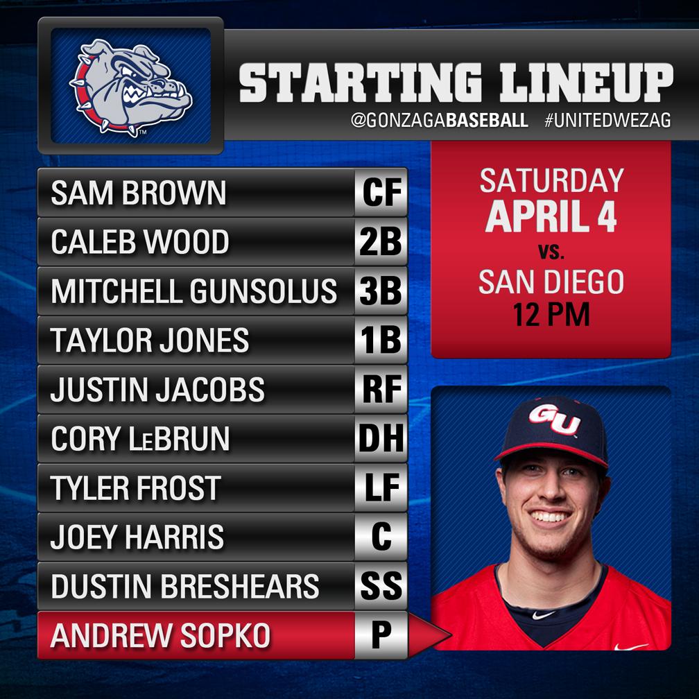 The Zags look to take the rubber match vs. San Diego at Noon! Here's the starters for @GonzagaBaseball! #UnitedWeZagpic.twitter.com/zfJWAlxAqZ