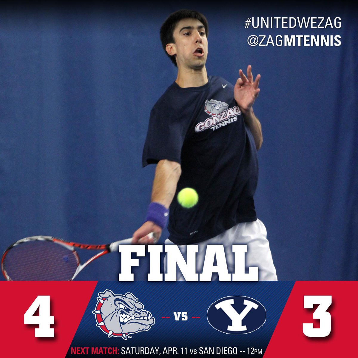 ZAGS WIN! @ZagMTennis beats BYU on Mijatovic's clinching point. Senior Day tomorrow at Noon! #UnitedWeZagpic.twitter.com/4IGQAlTqVg