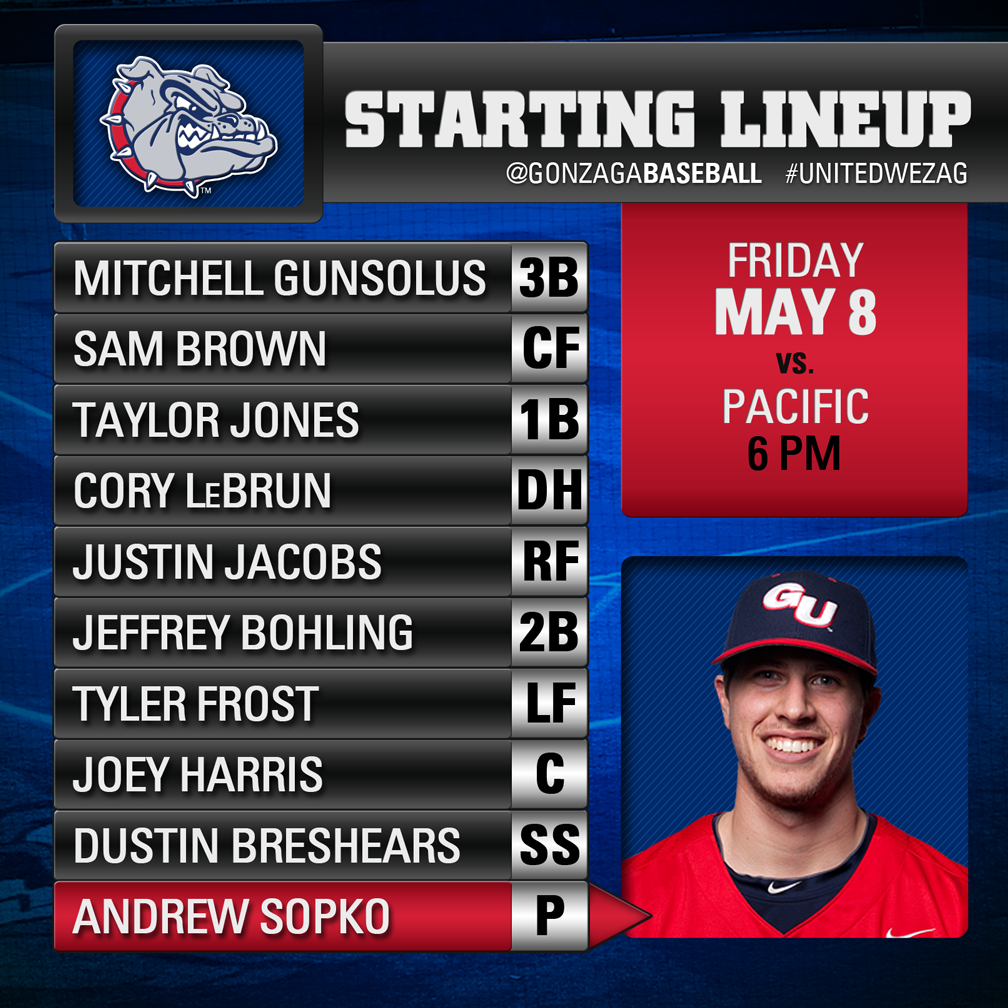 The starting lineup is in for @GonzagaBaseball! Come out and enjoy the sunshine! First pitch at 6pm. #UnitedWeZagpic.twitter.com/IuypqUkQrN