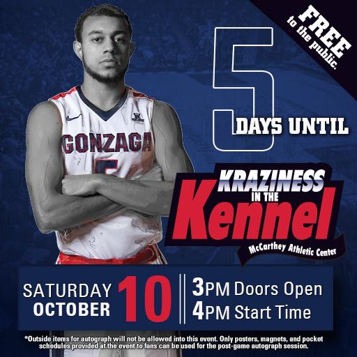 Kraziness in the Kennel is in 5 days! Join @ZagMBB this Saturday & get a look at the 2015-16 team! #UnitedWeZagpic.twitter.com/KfOFWELOq9