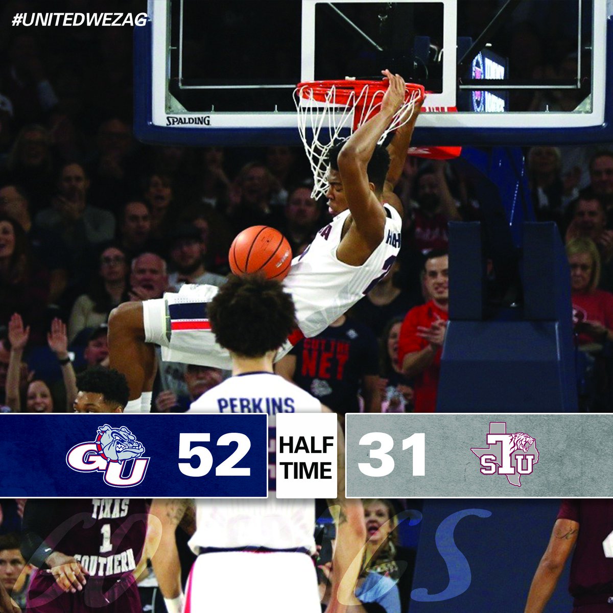 HALFTIME: @ZagMBB lead Texas Southern 52-31. Perkins leads all scorers with 15 points, all from behind the arc, as the Zags drain 9 three-pointers. #UnitedWeZagpic.twitter.com/ajHZE9x1cG