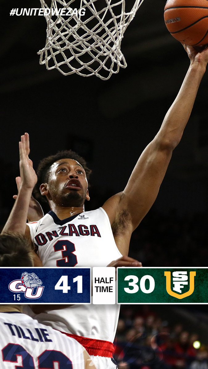 HALFTIME: @ZagMBB leads at San Francisco. GU made 57 percent of its shots from the field in the first half. Josh Perkins and Johnathan Williams both have 10 points for the Zags.