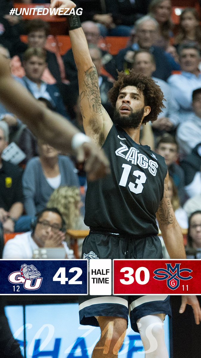 HALFTIME: Great half by @ZagMBB on the road at the No. 11 team in the country. Zags hold the nation's best shooting team (52.8 percent) to 37.5 percent from the field in the first half. Rui Hachimura and Johnathan Williams combine for 22 points. #UnitedWeZagpic.twitter.com/fTyPZceI6a
