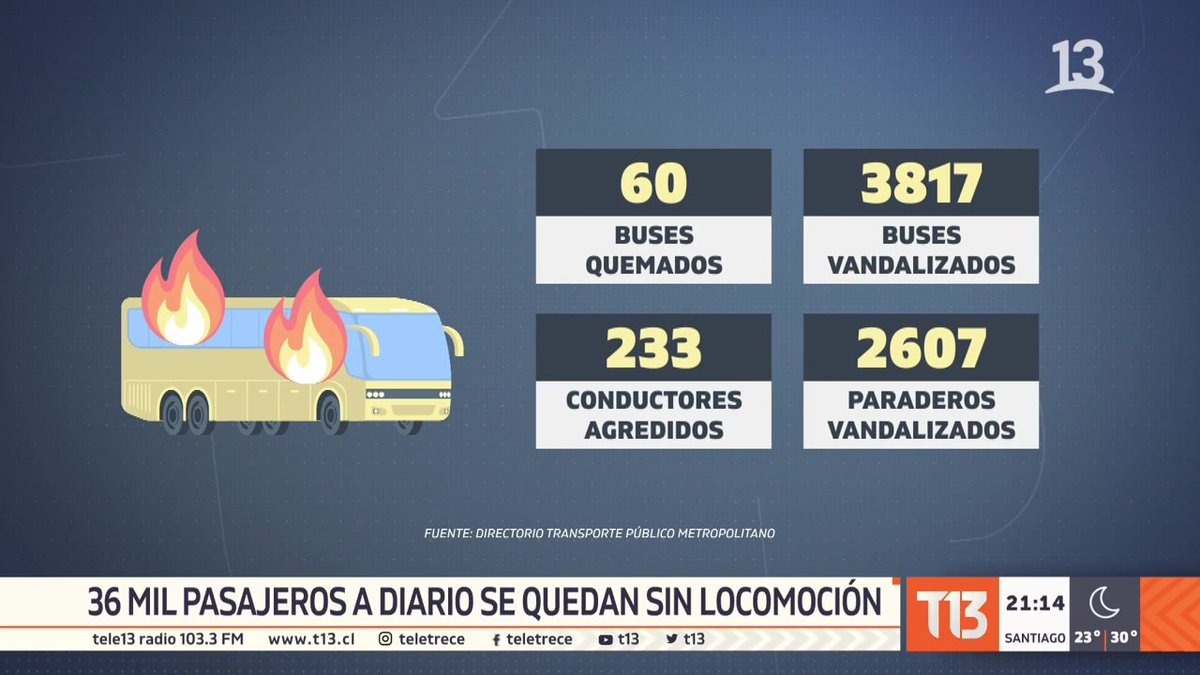 Diariamente en Chile, 36 mil personas no pueden tomar sus recorridos habituales de micro. Desde el comienzo del estallido social 60 buses han sido quemados. Anoche, nuevamente un bus fue atacado en la comuna de Huechuraba. EN VIVO