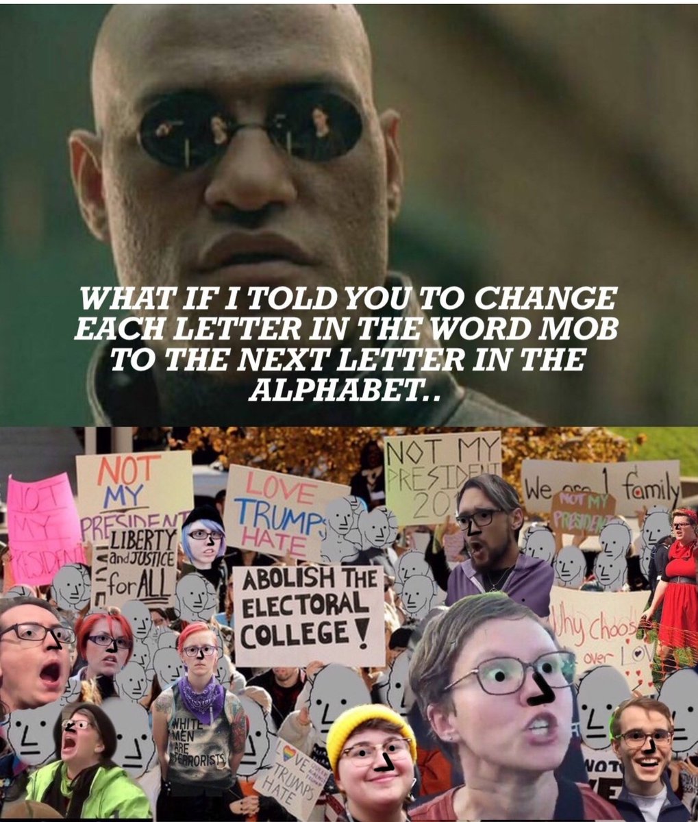 What happens if you take the word “MOB” and replace each letter with the next letter in the alphabet?pic.twitter.com/trb1wAQ8YV