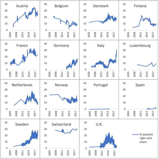 Here's the polling for the primary populist right party in 15 western European countries from 2005 to June 2018 (part of upcoming paper by