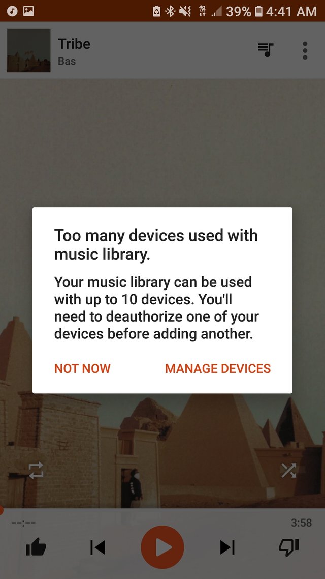 Hoje, vindo para o trabalho o app parou de tocar as músicas. Mostrava esse erro, sendo que eu nem tinha 7 devices. E procurando no twitter, parece que muita gente tb teve esse problema.pic.twitter.com/fmnfiQILAc