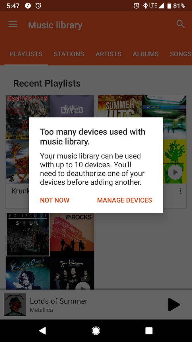 @GooglePlayMusic I keep getting this message when listening to music this morning. I have only used your service on my one phone. Have tried force stopping the app, restarting phone, and refreshing from the settings page. Keeps happening, please advise.pic.twitter.com/zl5raAFH5S