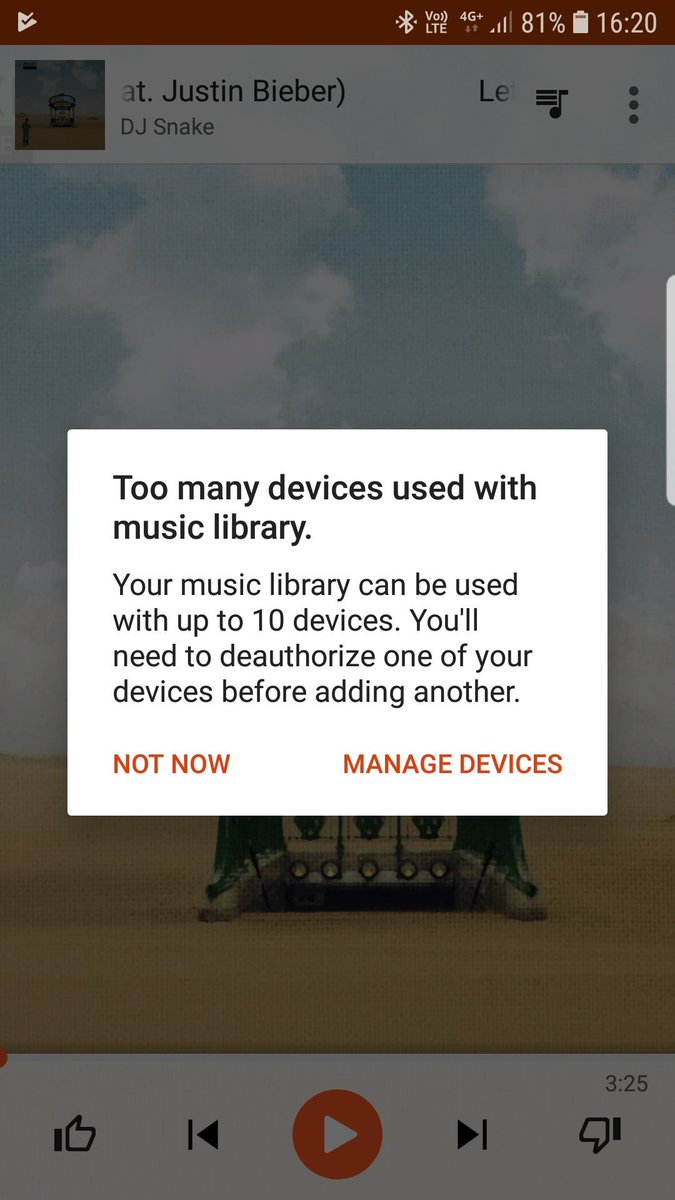 I dont have 10 devices linked to my account. I still get the above prompt. Not able to play any songs on google music