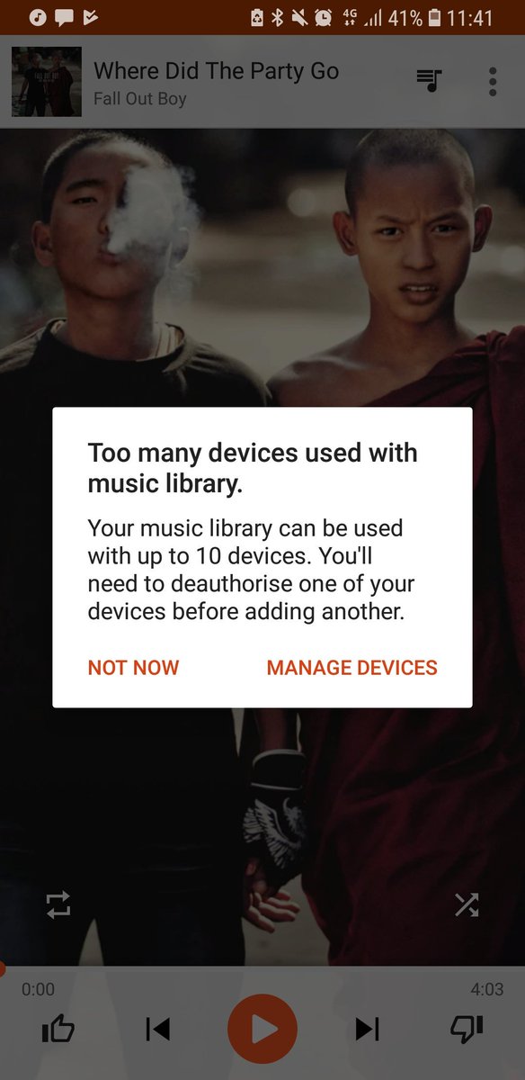 @GooglePlayMusic why do i keep getting this message.. i dont have any other devices ... this app was working fine yesterday.pic.twitter.com/g91rtcgwO4