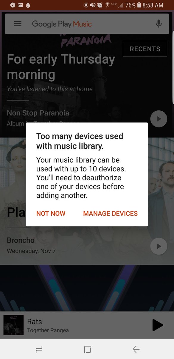 @GooglePlayMusic This seems to be happening for a lot of us. I removed all my authorized devices despite being nowhere near the limit and it still gives me this error? https://www.reddit.com/r/googleplaymusic/comments/9t7znz/anyone_else_having_this_issue_i_only_have_one/ …pic.twitter.com/fbGzE6F1Ih