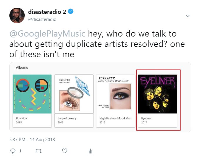 @GooglePlayMusic who do we contact about fixing metadata (I am also the artist Eyeliner but there is now a second different Eyeliner appearing on the same artist page) .. this album is not minepic.twitter.com/DpXQbdaMni