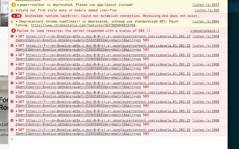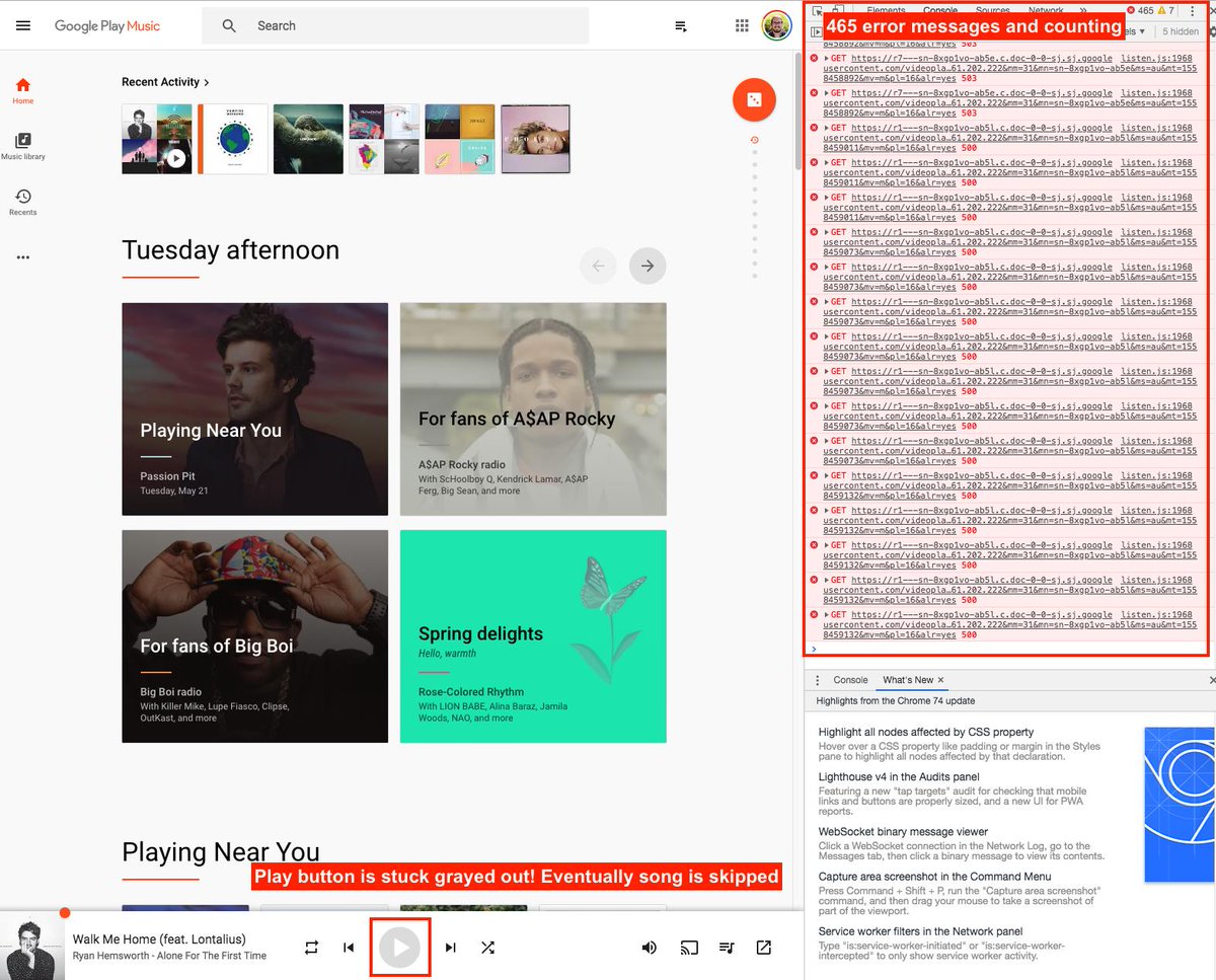 Hey! Yeah I'm using the browser app. I'm seeing the songs take either a long time to start playing, or they never start playing with play button staying grayed out forever until eventually they are skipped. Chrome has all these error messages, several new ones per second:pic.twitter.com/EJznaz7rLG