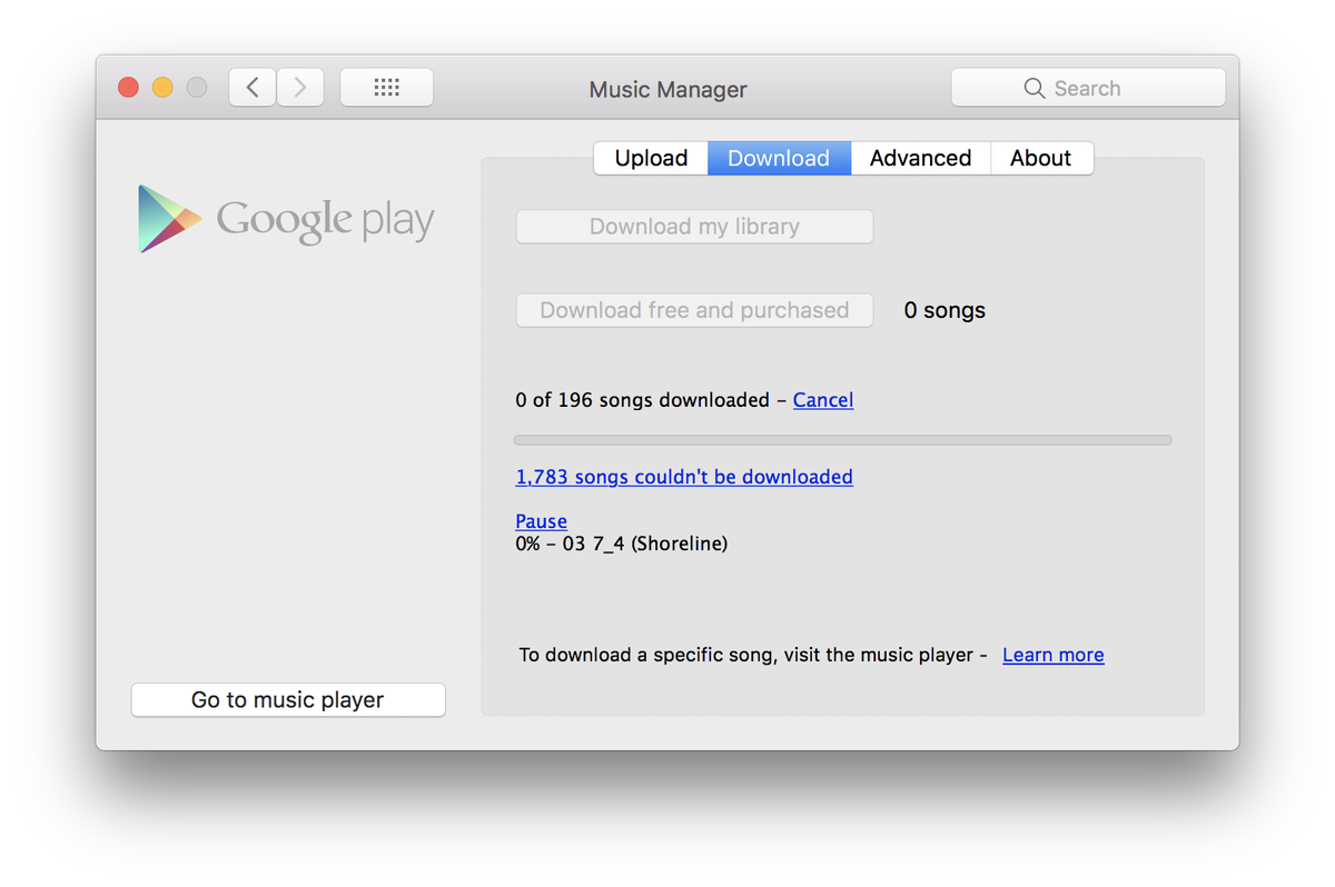 From MusicManagerHelper.log: Downloads from http://sj.googleusercontent.com fail because of an issue the software has with the certificate: /C=US/ST=California/L=Mountain View/O=Google Inc/CN=*.googleusercontent.com (unable to get local issuer certificate:0x00000000)