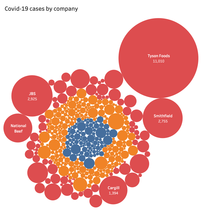 This week, Tyson Foods surpassed 11,000 worker cases of Covid-19 (9% of its workforce), by far the most of any meatpacker. Cases are ticking up at the company's poultry plants in Arkansas. https://public.tableau.com/profile/leah.douglas#!/vizhome/Casesbycompany/Dashboard1 …pic.twitter.com/GF2OlPwn60