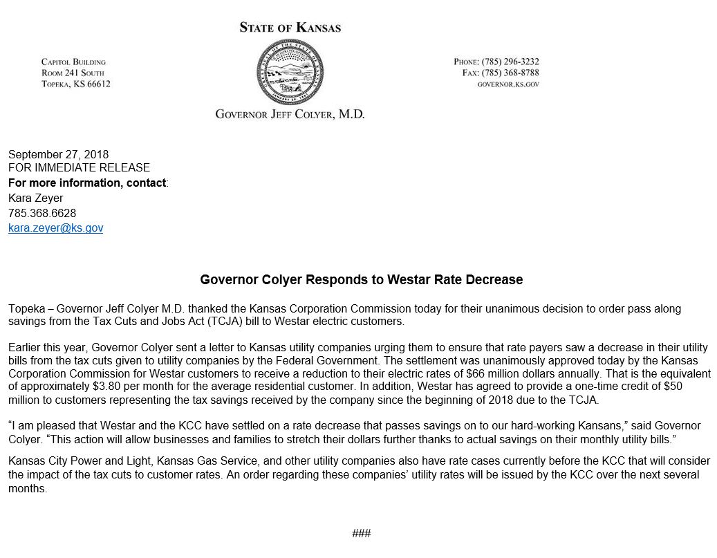 I am pleased that @WestarEnergy and the KCC have settled on a rate decrease that passes savings on to our hard-working Kansans! #kslegpic.twitter.com/WXYCVfeYm8