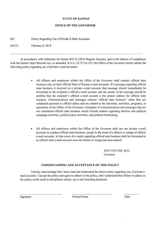 Full text of my executive orders on transparency. First, number 1805: regarding KORA requests. #kslegpic.twitter.com/XPxxW2pgSv