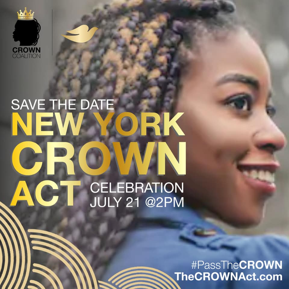 New York! Celebrate the passing of The CROWN Act today, July 21! 👑 Join Tai Beauchamp, Lt-Gov Kathy Hochul, & the #CROWNCoalition for 𝗙𝗥𝗘𝗘 Virtual Summit at 𝟮:𝟬𝟬 𝗣𝗠 𝗘𝗦𝗧 at http://thecrownact.com  @LtGovHochulNY @Dove @NatUrbanLeague @ColorOfChange @Western_Center pic.twitter.com/RW4XU9oO4P