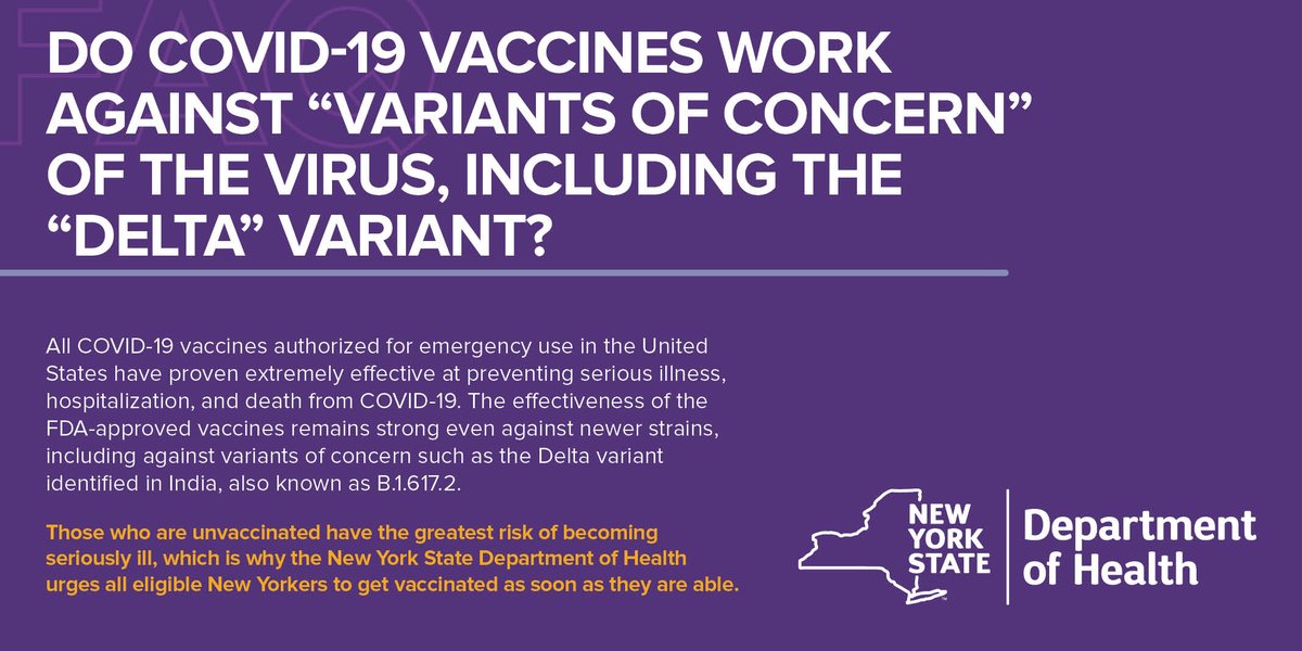 Those who are unvaccinated have the greatest risk of becoming seriously ill from COVID-19. All eligible New Yorkers are encouraged to get vaccinated as soon as they are able. #VaccinateNY http://covid19vaccine.health.ny.gov/frequently-asked-questions-0 … pic.twitter.com/jbPdkwcYMp