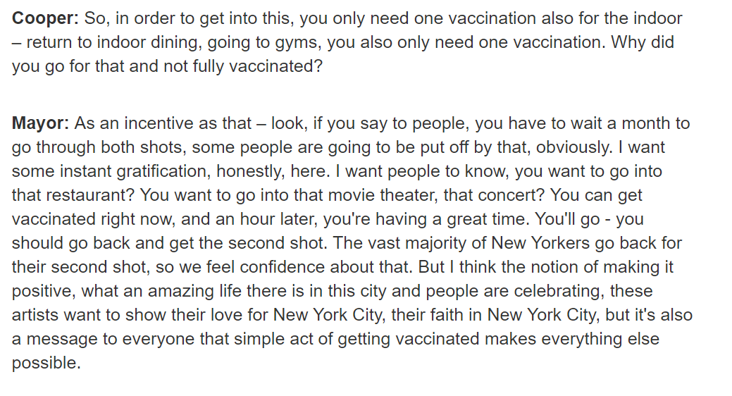 When do you plan to require FULL VACCINATION for access to indoor venues in NYC -- before or after the next variant? If we expect overseas travelers entering the US (most via JFK/LGA), shouldn't we practice what we preach? NYC's current policy is deceptive window-dressing.