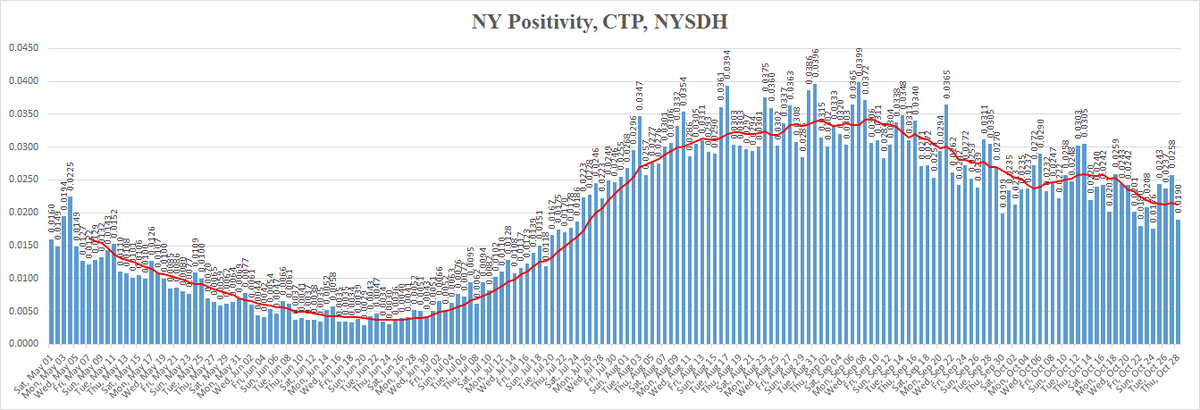 This is possibly the first sign or real improvement in last 10 weeks. HHS reports drop as well, 2347 COVID patients in NY hospitals, 467 of these with confirmed COVID in ICUs. Positivity went down marginally and so did the Rt value at 0.78 (Harvard Chan). We'll see tomorrow.pic.twitter.com/tWfZTRF9WD