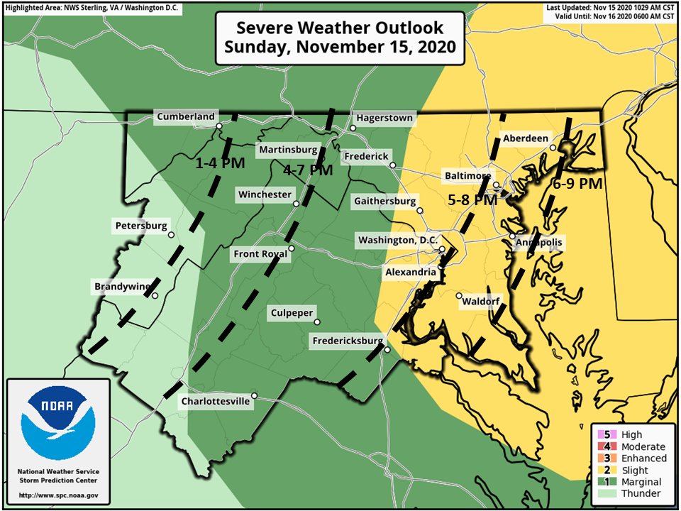 The Storm Prediction Center has upgraded to a Slight Risk for locations generally east of I-95. While showers may have little to no thunder & lightning, very strong wind gusts are possible as this line moves eastward. Approximate timing is listed on the graphic.pic.twitter.com/wgM8OBqKKr