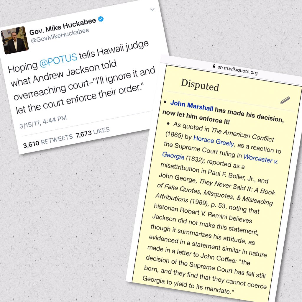 @GovMikeHuckabee is blowing smoke. Bigly. Quote wrong. https://twitter.com/govmikehuckabee/status/842159481601593345 … https://en.m.wikiquote.org/wiki/Andrew_Jackson … /2pic.twitter.com/tTZszYrmQH