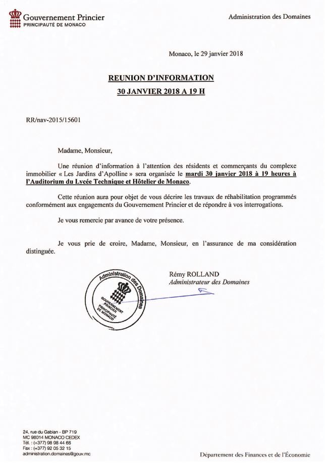 An information meeting for the residents and traders of the "Les Jardins d'Apolline" complex will take place tomorrow at 19:00 in the Auditorium of the Lycée Technique et Hôtelier de Monaco. #jardinsdapollinepic.twitter.com/LNEqFpuolr