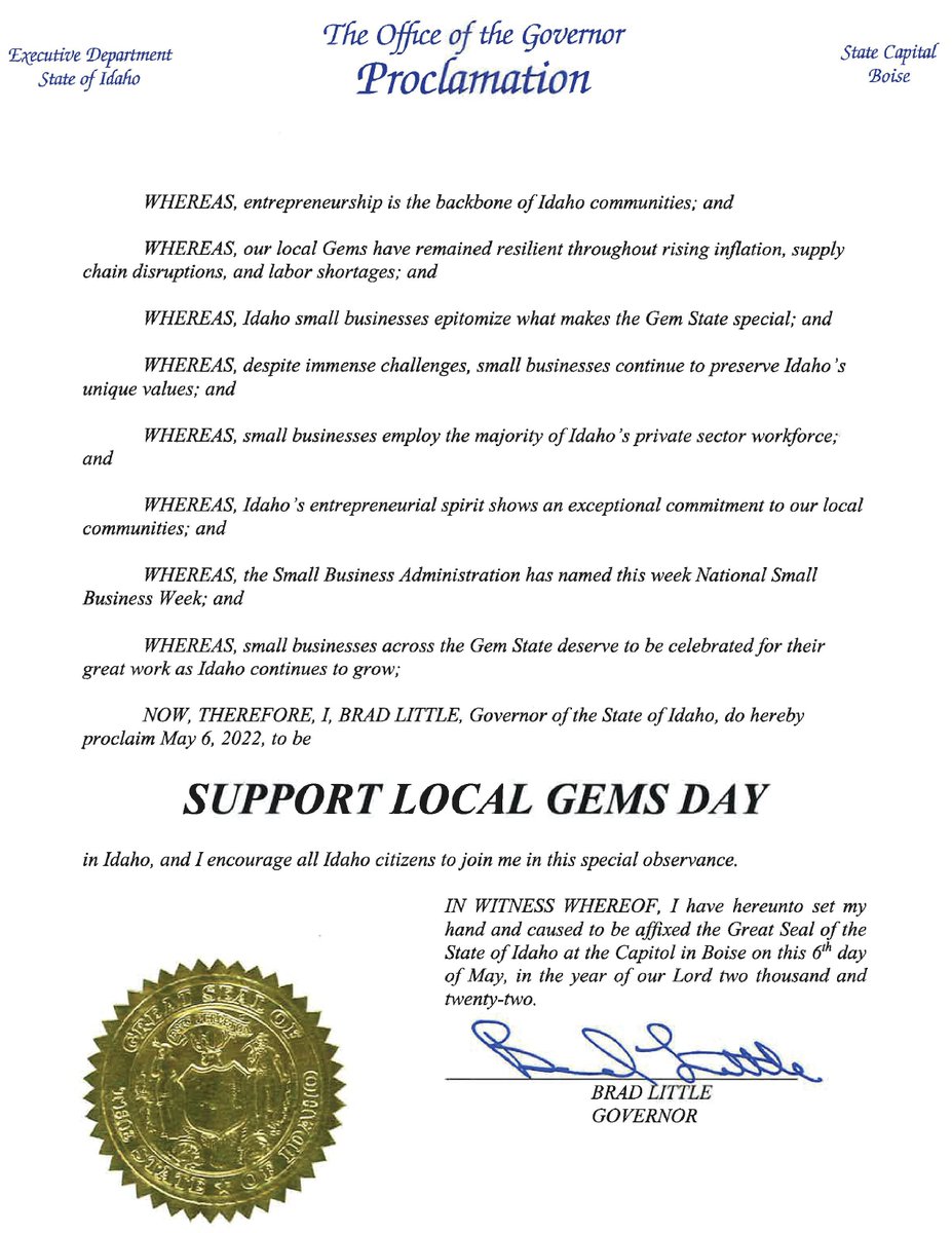I issued an official proclamation celebrating Buy Idaho Day on May 14. Thank you to Buy Idaho and the Idaho Women’s Business Center for their continued support and promotion of Idaho businesses!pic.twitter.com/LA4ljARwRU