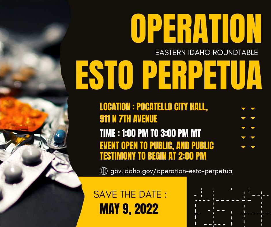 Join us in Pocatello Monday, May 9 from 1-3 PM for my Operation Esto Perpetua roundtable as we discuss new strategies to fight the growing drug threat in Idaho. Public testimony starts at 2 p.m.pic.twitter.com/QJ3uSSRJpA