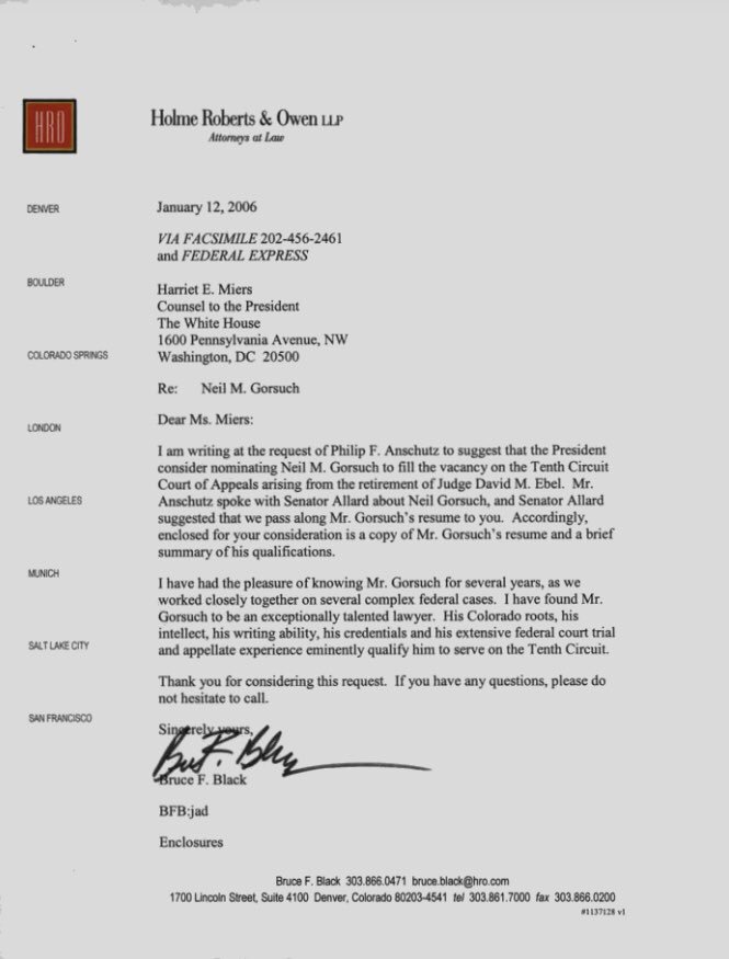 https://www.documentcloud.org/documents/3517036-Anschutz-recommends-Gorsuch.html … Although Gorsuch wasn’t under consideration, a letter from Anschutz to Harriet Miers put him on the 10th Circuit. A reasonable person might view Anschutz’s $500,000 to a McConnell Leadership PAC—one day before McConnell shut down Garland—with suspicion.pic.twitter.com/1cbdRd6Upg