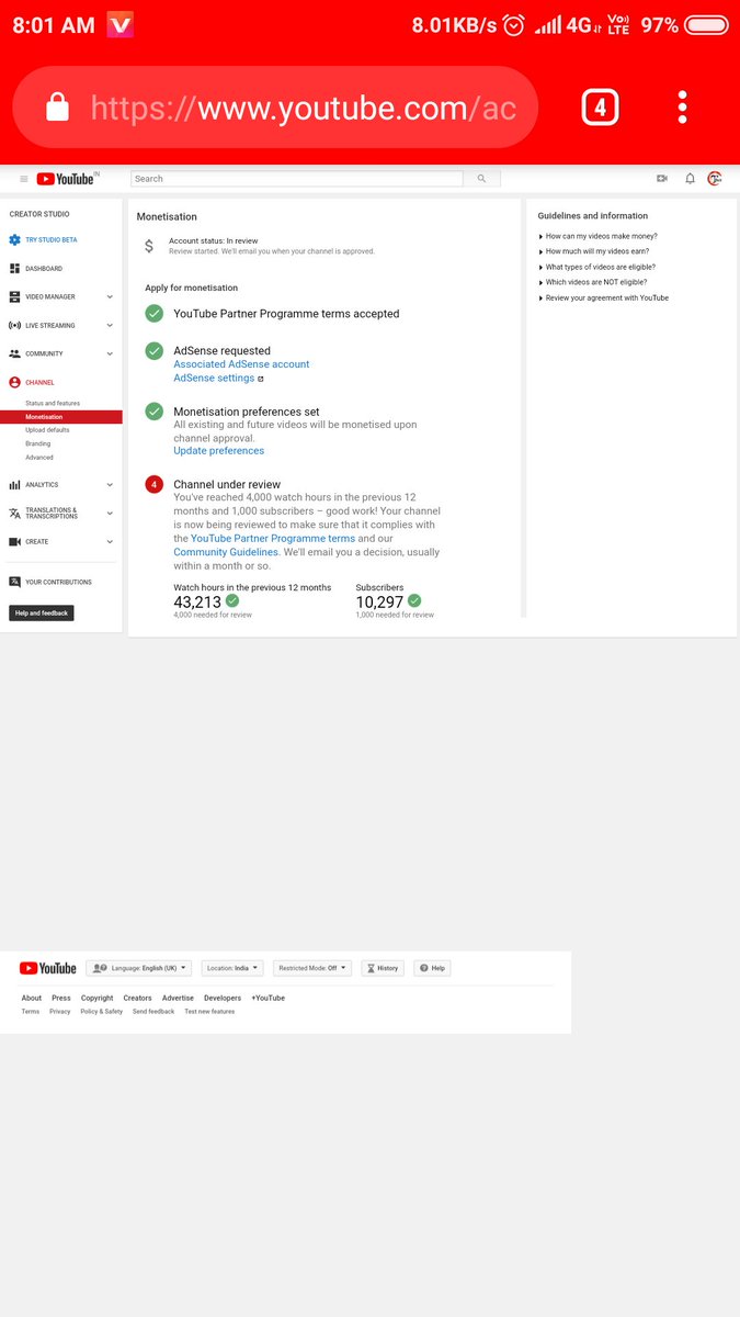 @TeamYouTube Hi YouTube teams, I follow all YouTube T & c . But my channel Monetization is not Enable and channel in review 4 months ago tell me what is fault otherwise please review my channel Channel link https://www.youtube.com/channel/UCl4QXhHRepoKx9KQ3a_olmA …pic.twitter.com/qaCsDWfa9I
