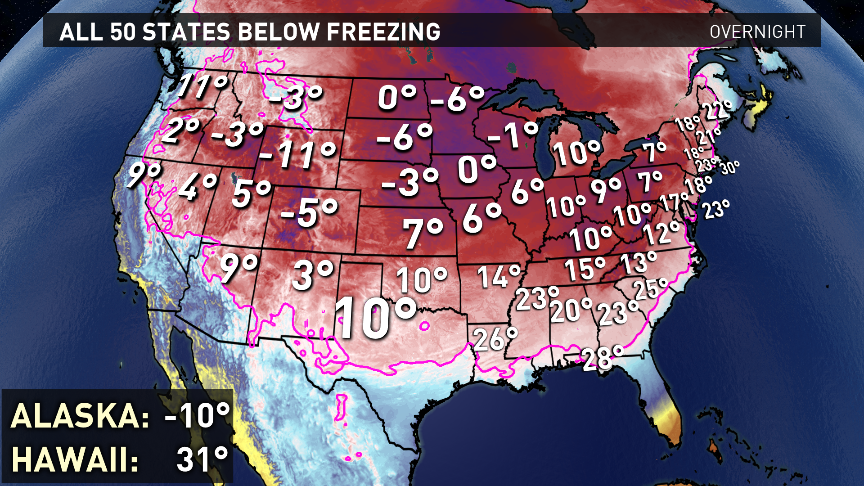 @grant_gilmore: All 50 States (yes, even Hawaii) drop below freezing tonight. Here are some of the extremes. pic.twitter.com/bh3NI1f8uj”