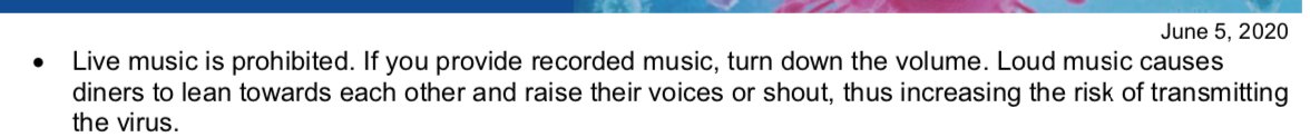 Also: no live music or loud music. It makes people lean close to one another when talking.pic.twitter.com/tISoonMAVf
