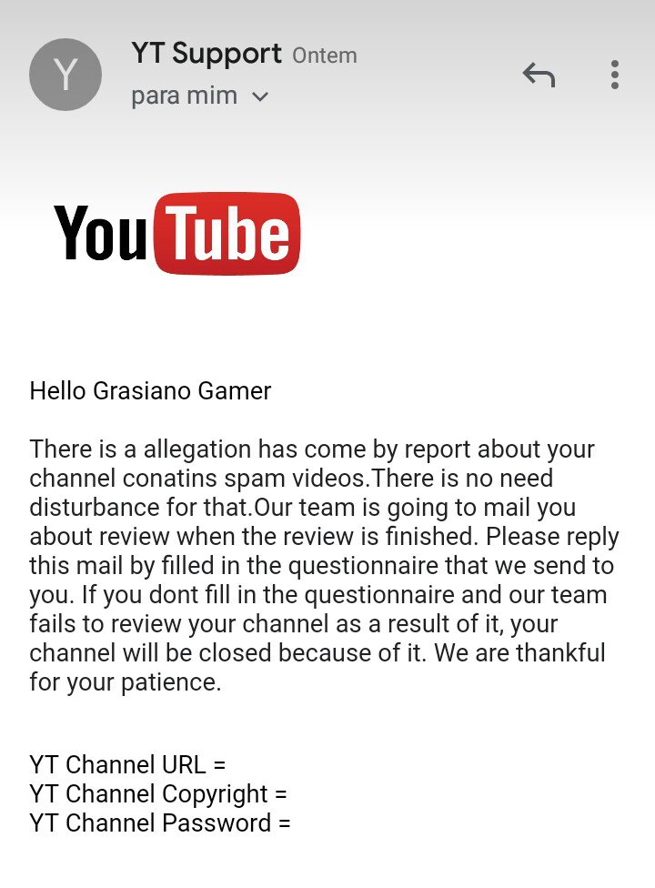 Vocês por acaso pedem isso mesmo ...link e senha do canal para analisarem ...porque ainda não enviei com medo de se tratar de uma fraude... @YTCreators @YouTube @YouTubeBrasilpic.twitter.com/tnVqeGdJT2