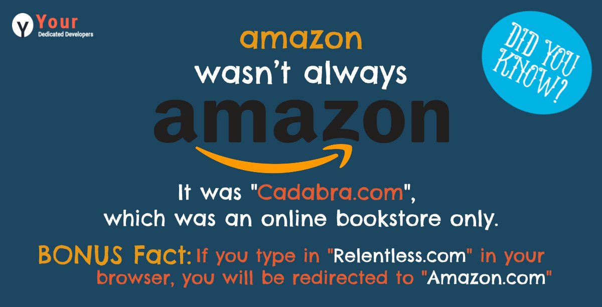 #DidYouKnow Amazon was actually named http://Cadabra.com@JeffBezos explored many options in the 90’s, some of which still redirect to Amazon, like http://Relentless.com Bonus: On the logo, the arrow is directed from a to z, indicating that you can buy anything on Amazonpic.twitter.com/K8n6r1SP93