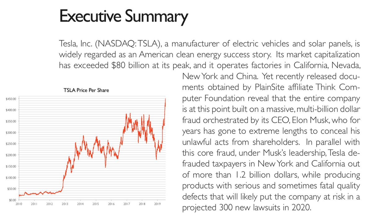 $TSLA by short seller Plainsite. Regardless of your views on Musk (I like him + TSLA), this is a substantial work worth reviewing. https://www.plainsite.org/realitycheck/tsla.pdf …pic.twitter.com/3ZyqAjiJN5
