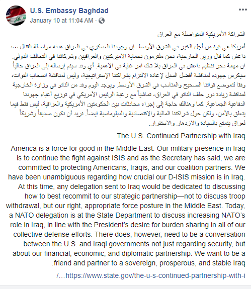 #العراق . أي وفد سيتم إرساله إلى العراق حالياً سيكرس جهوده لمناقشة أفضل السبل لإعادة الالتزام بشراكتنا الإستراتيجية، وليس لمناقشة انسحاب القوات، وفقا لتموضع قواتنا الصحيح والمناسب في الشرق الأوسط.pic.twitter.com/J4lZnZPVEv