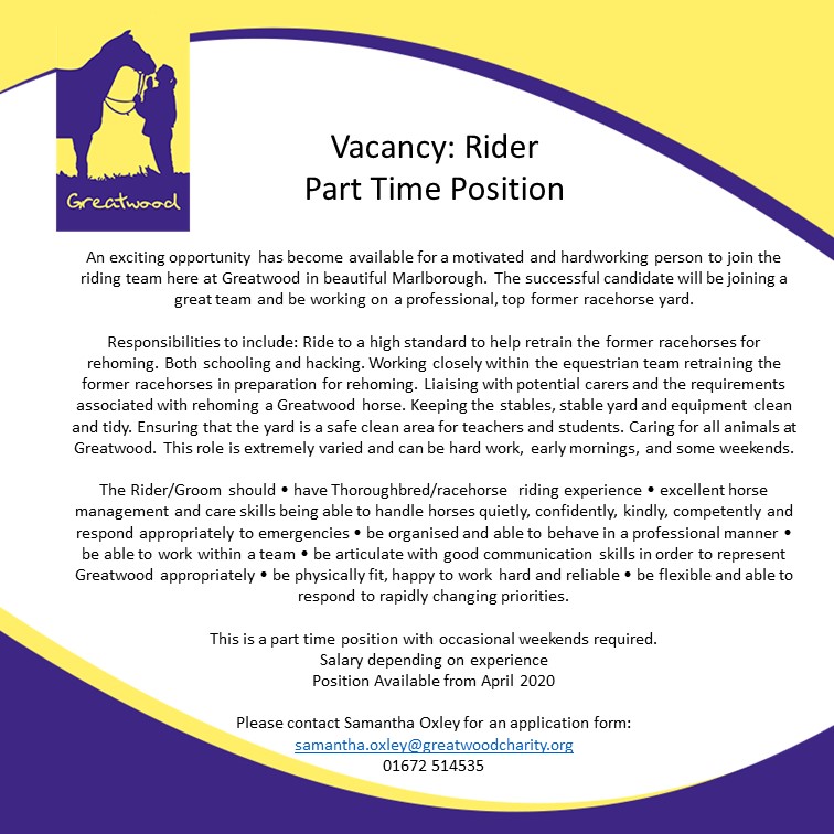 Vacancy: Rider (Part Time Position) An exciting opportunity has become available for a motivated and hardworking person to join the riding team. For more information, including an application form, please contact: samantha.oxley@greatwoodcharity