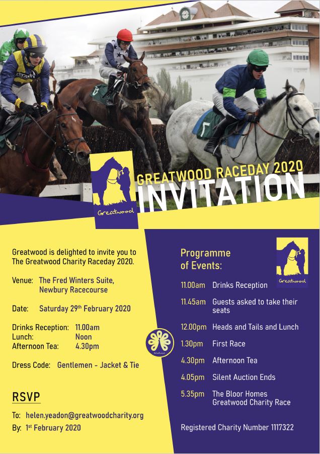 @GreatwoodHorses annual fundraising event@NewburyRacing on 29th February.#CharityRacedayhttps://twitter.com/GreatwoodHorses/status/1221742219545272321 …