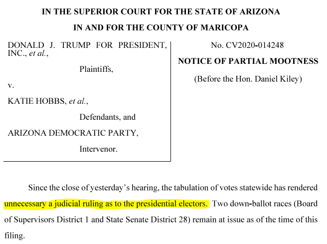 BREAKING Trump's Arizona lawyer accepts election results that Trump rejects. Tells judge he doesn't have to trouble himself anymore with ruling on Trump race.