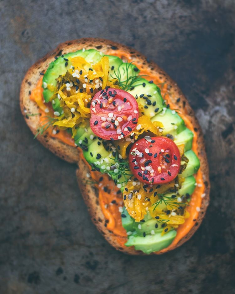 gluten-free toast topped with sriracha mayo + sliced avocado + turmeric black pepper kimchi + fresh dill + cherry tomatoes