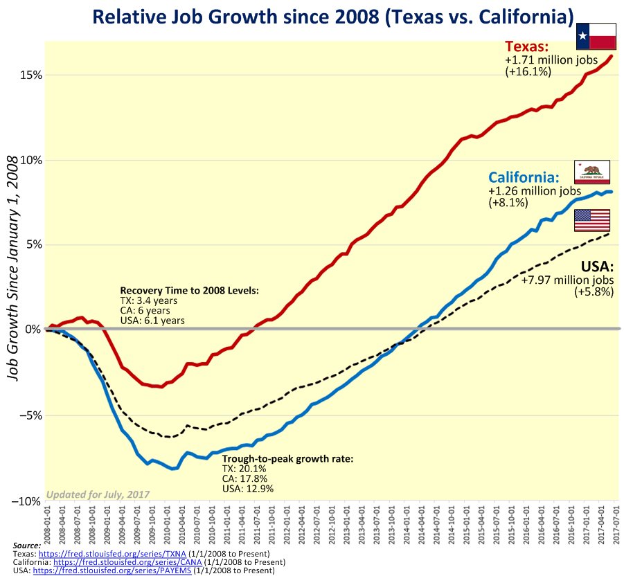 Job Growth Since January 2008: CA vs. TX vs. USA. Despite its smaller economy & population, TX created 451,000 more total jobs.pic.twitter.com/4YbIuodzvG