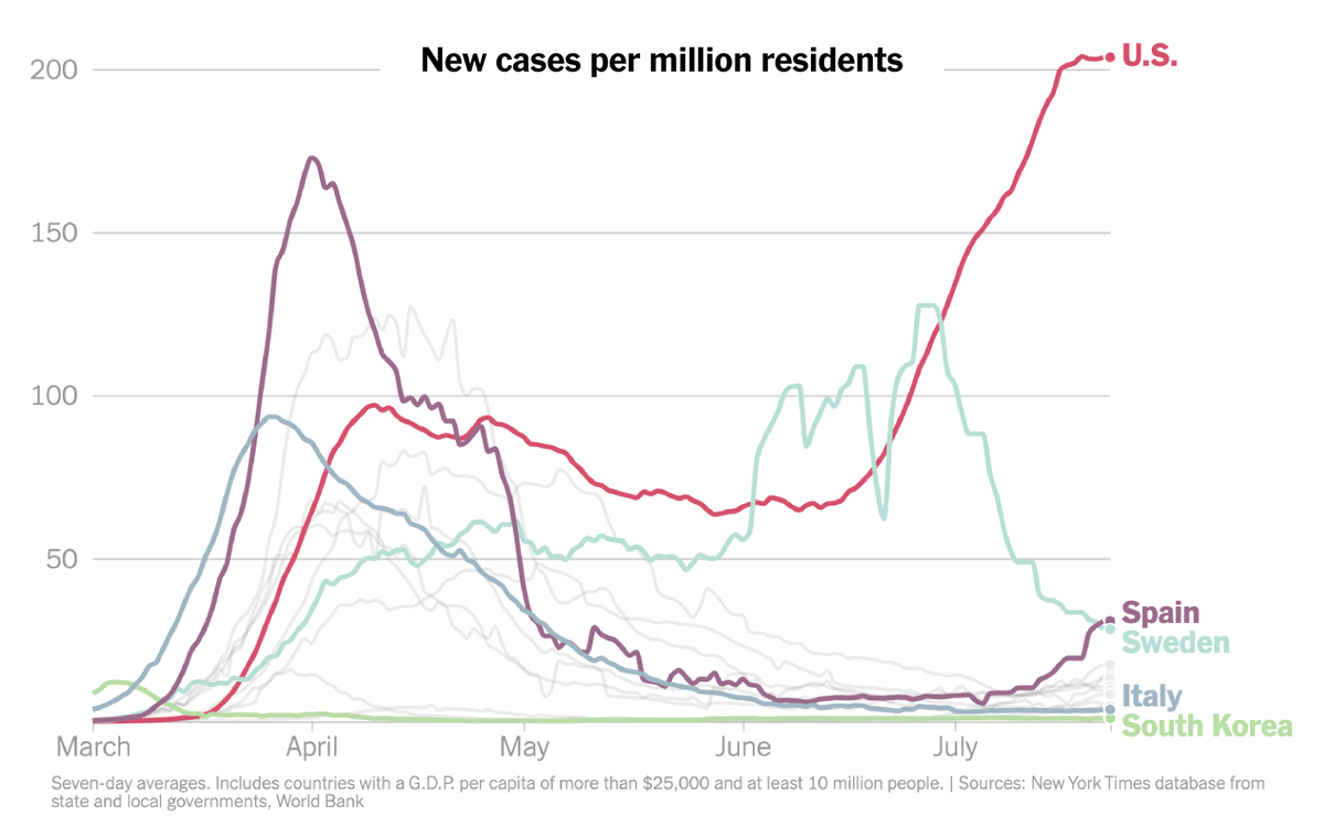 NEW: The recent coronavirus surge makes the U.S. a big outlier among large, high-income countries. Even Sweden, where cases surged after the government chose to forgo a strict lockdown, has seen cases drop. https://www.nytimes.com/interactive/2020/07/23/us/coronavirus-hotspots-countries.html …pic.twitter.com/J7rILiAVdk