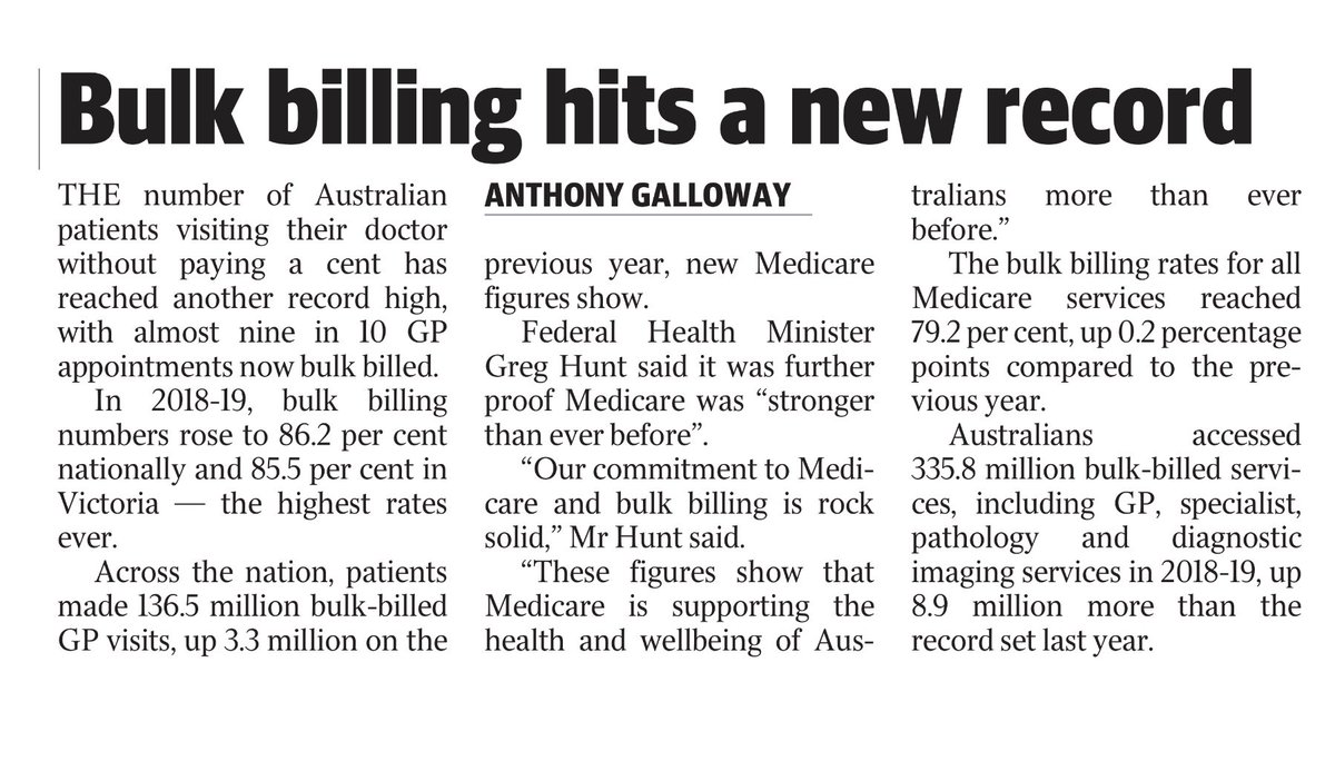 Pleased bulk billing figures show an all-time national record of 86.2%, up 4% from when we came into Government.pic.twitter.com/GjvtA8GazB