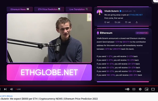 One fake stream featuring Vitalik Buterin attracted more than 150K viewers, who were encouraged to visit the websites with instructions on how to double crypto savings in real time.pic.twitter.com/TpIwHjwaSK