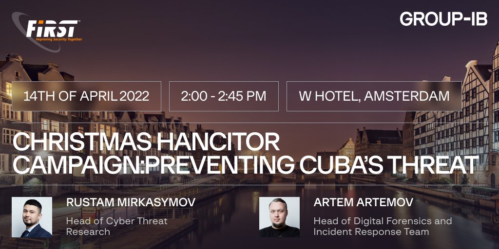 @GroupIB_GIB team at#FIRSTAMS2022@FIRSTdotOrg Technical Colloquium in Amsterdam next week! Our#DFIR and#ThreatIntelligence experts will present the cases of#Hancitor operators attempting to encrypt a European company with#Cuba#ransomware https://lnkd.in/deeBtsj6 pic.twitter.com/5sXqwtFCyv